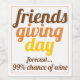 Bold typography Friendsgiving Day funny meme of wine wine label. It features the phrase "Friendsgiving day fore cast 99% chance of wine" in bold typography. Colours brown, orange and yellow.