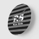 Bold White Monogram & Name, Lt Grey Lines on Black Round Clock