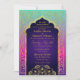 Carte à thème Bollywood ou les nuits arabes en violet, rose chaud, et aqua ombre aux accents de papier doré.