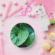 Des feuilles hosta verdoyants qui scintillent avec des gouttes de rosée font un étonnant bol de papier. Ils seraient parfaits pour une fête de jardin, un mariage extérieur ou une fête.