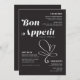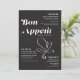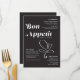 These vintage style 5" x 7" wedding dinner menus with white lettering and a stylized heading, "Bon Appetit," in large black letters with a heart accent on a black background. The menu has placeholders for 2 appetizers, 2 entrees, and 2 desserts and the wedding couple names.