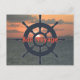 Carte postale avec coucher de soleil tropical et roue du navire.