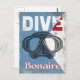 Bonaire Caribbean vintage scuba mask travel poster design. A blue and white diver down flag background with a retro scuba mask and word "Dive" at the top.