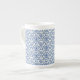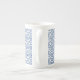 Cette charmant tasse de style porcelaine osseuse est présentée en blanc avec un design d'impression damassé bleu. Customisez cet objet ou achetez tel quel.