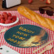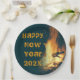 Backyard bonfire New Year’s Eve party paper plates. Plates come in two sizes and have a burning fire image and custom text. The sample wording is “Happy New Year” with year date and is easy to change for your needs. Dark blue colour with orange and yellow bonfire and distressed font in orange.