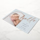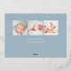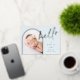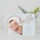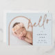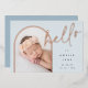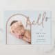 Un design élégant de faire-part de naissance photo avec une mise en page unique, cette carte chic présente une photo verticale en forme d'arche sur un fond bleu pâle poussiéreux doux, avec "bonjour" en typographie script écrite à la main en feuille d'aluminium rose or. Personnalisez avec le nom de votre nouveau bébé, sa date de naissance et ses statistiques de naissance, et ajoutez un message personnel au dos, ainsi que trois photos carrées supplémentaires.