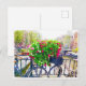 Cette carte postale représente une scène du haut d'un pont à Amsterdam, avec des fleurs lumineuses et magnifiques, ainsi que des vélos garés le long du bord. Vous pouvez voir des bâtiments à l'arrière-plan.