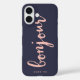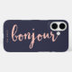 Bonjour! Add a touch of Parisian flair to your iPhone with this chic case. Design features "Bonjour" in peachy pink handwritten-style script, on a deep midnight blue background. Use the optional personalization field to add a name, monogram or message.