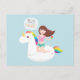 Bonjour été ! Bienvenue la chaleur brûlante de l'été avec cette carte postale qui a une illustration rafraîchissante d'un char mignon de piscine à licorne avec crinière arc-en-ciel et queue. Une jeune fille joyeuse fait le tour en agitant un popsicle de crème glacée dans sa main.