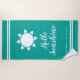 Bonjour Sunshine serviette de plage d'été avec nom personnalisé. Serviettes de plage personnalisées avec élégante typographie de script de brosse et rayures. Ajoutez votre propre citation drôle, nom ou monogramme. Idée cadeau d'anniversaire mignonne pour femme, fille, petite amie, fille, amie, tante, grand-mère, soeur, mère, épouse mariage, femme de ménage, patronne, retraitée, couple etc. Accessoires d'été amusants pour plage et piscine. Design de lettrage à la main classique avec couleur arrière - plan bleu turquoise personnalisable. Des cadeaux de luxe pour elle. Idéal aussi pour les couples mariés en lune de miel.
