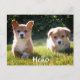 Qui peut résister à la douce face d'un Welch Pembroke Corgi chiot chien. Cette carte postale mignonne présente deux corgies blanches et bronzées jouant dans l'herbe verte. Ces petits sont prêts à vous aider à envoyer des salutations Bonjour à la famille et aux amis