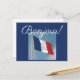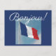 Bonjour! French greeting in a script font with a photo of the flag of France.