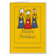 Des cartes de fin de année personnalisables avec 3 chorales dames, un arrière - plan jaune et le dicton Happy Holidays. Des cartes parfaites à envoyer à la famille et aux amis pendant la saison des fêtes.