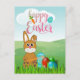Cette carte postale de Pâques est trop mignonne avec le lapin lapin assis sur l'oeuf peint, et une pelouse gazonnée avec des collines ondulées. Cette carte postale de vacances de Pâques a été créée pour les enfants. Le design comprend un lapin de Pâques, des oeufs colorés et un accueil en fausse parties scintillant. Ajoutez votre salutation à l'envers et envoyez-la à une fille ou à un garçon.