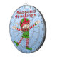 Bonnes Fêtes Elf Cible de flechettes présente un arrière - plan bleu clair avec des tourbillons et des flocons de neige, un elfe Happy Père Noël en rouge et vert, tenant un sucre de canne coloré. Le texte rayé rouge stylisé est une Bonnes Fêtes. Parfait pour les jeux de Noël ou comme cadeau de Noël! Comprend 6 fléchettes en laiton (3 vols dart du drapeau américain et 3 vols dart au Royaume-Uni). Carte de taille de régulation (18" de diamètre, 1" d'épaisseur). Fini avec cadre en aluminium et crochet suspendu. Cette conception a été créée à l'aide de artwork©delightful-doodles.com (http://delightful-doodles.com/) original