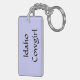 Un porte - clé violet avec un porte-baril et un double coeur violet. Le côté arrière dit "Idaho Cowgirl" et a un fond pourpre. Personnalisez avec votre nom ou votre texte. Conçu par Robin D. Cox.