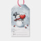 Cette illustration adorable d'un bonhomme de neige tenant un grand cœur rouge crée une touche parfaite pour répandre la chaleur et l'amour lors d'une fête de Noël ou de la Saint-Valentin, d'un mariage hivernal ou de toute autre célébration hivernale. Cette étiquette de cadeau polyvalente convient parfaitement aux amoureux, aux conjoints et aux enfants !