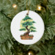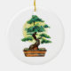 traditional watercolor painting of a japanese bonsai tree growing from a brown pot in front of the yellow sun on a ceramic ornament.