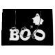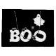 Cute and funny white Halloween graphic design featuring the word "BOO" looking at a ghost dangling a spider with scared eyes.