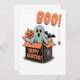 Get ready to spook in style with this playful Halloween design! Featuring a friendly ghost popping out of a "Happy Haunting" box surrounded by classic Halloween elements like a jack-o'-lantern, bat, and spider. Perfect for Halloween parties.
