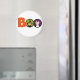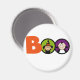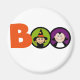 Cute and colourful Halloween T-shirts, tote bags, cards, stickers, mugs, and other Halloween apparel and gifts with a witch and frankenstein that reads BOO!