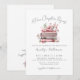 A New Chapter Begins. Celebrate the bride-to-be with this cute and elegant book-themed bridal shower invitation. At the top, “A New Chapter Begins” is written in a soft handwritten script, setting a sweet and joyful tone for the celebration. Just below, a watercolor stack of books appears in soft blush pink and gray tones. The books are accented with delicate pink flowers and fresh green leaves, creating a romantic and feminine focal point.