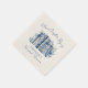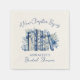 A sweet and elegant paper napkin designed for a book-themed bridal shower. Centered on the napkin is a watercolor stack of blue and white books accented with delicate blue chinoiserie and French toile-inspired floral patterns, with coordinating blue and white flowers for a refined and timeless look.