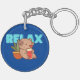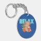 This adorable keychain features a cartoon capybara sitting in an orange pot next to a green plant. The capybara is holding a red book and appears content, with the word “RELAX” above it in bold, light blue letters. This keychain is perfect for capybara lovers and those who enjoy a relaxed, bookish vibe. Made from high-quality materials, it’s a delightful and durable accessory for your keys, bag, or backpack.