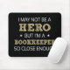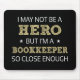 I may not be a hero, but I'm a Bookkeeper so close enough humourous word art in sans-serif and doodle cross-hatch font lettering in white and golden yellow.