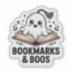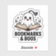 Bookmarks & Boos — a cute spooky sticker for readers who love a chill down the spine. A friendly ghost bookmark peeks from antique pages, framed by tiny stars and leaves. Perfect for bookstagram, laptop stickers, or adding cozy Halloween vibes to your journal.
