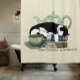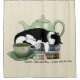 A cute black and white cat sleeping on a pile of books with a green teapot and a cup of tea.