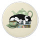 A cute black and white tuxedo cat sleeping on a pile of books with a green teapot in behind and a cup of the in front