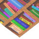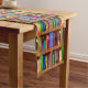 The colourful library bookshelf pattern on this table runner is perfect for bibliophiles / proud bookworms. The bright, repeating pattern is made up of 25 books that lean or stand straight, all on a shelf with a wooden look.