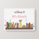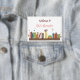 A white pin button with watercolor books on a shelf . Great for welcoming your young students on the first day of school . Also available in black and teal colours .
