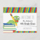 This postcard features a bookworm holding a pencil and sitting on a stack of books. The background is a colourful diagonal stripe pattern with a white box in the centre. Customizable text allows you to add the teachers name, grade and school. The back of the postcard features customizable text for a personal message from the teacher.
