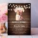 Lovely personalized rustic BOOTS and BUBBLY bridal shower invitations for that southern girl (Texas hold'em). Blush pink cream brown watercolor peonies flowers in cowboy / cowgirl boots and bubbly Champagne with flute glasses. Wood panels, brown barn colour with twinkling lights. Perfect invites for any rustic western country / south (farm) shower party theme; bachelorette theme, summer, spring or any time of year. Easy editable template cards; colour, text, font can be changed. Digital / download option. See matching items to coordinate your whole party!