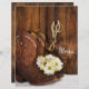 Le thème équestre informel mais élégant Cowboy Boots, Daisies et Horse Bit Country Western Mariage Menu peut être customisé avec les détails du repas que vous pourrez servir à votre fête de fiançailles rustiques ranch, déjeuner de douche nuptiale, réception mariage ou brunch mariage en ajoutant la salade ou le premier plat, entrée ou deuxième plat et dessert ou troisième plat. Ce charmant menu à thème équin personnalisé propose une photographie florale pittoresque d'une paire de bottes de cowboy, un bouquet de fleurs blanches et jaunes, un collier de perles blanches, des chevreuils et des reins en cuir avec un arrière - plan brun patiné en bois de grange. Idéal pour une fête décontractée à la ferme.