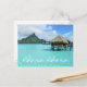 Postcard with a luxury overwater bungalow resort in the clear blue lagoon of the pacific island of Bora Bora, near Tahiti in French Polynesia with the text: 'Bora Bora, French Polynesia'.