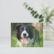 This fun canine postcard features a portrait of a happy black and white Border Collie puppy dog with a natural green grassy background. The back of the card is blank for your message.