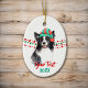Un beau chien noir et blanc de Border Collie porte un casquette de Père Noël rouge et vert devant des cordes de perles rouges et vertes de Noël des deux côtés de cet ornement. En bas se trouvent deux champs de texte en rouge et vert correspondant à votre propre texte. Le dos a la même image avec un troisième champ de texte en rouge. Parfait pour tous ceux qui appartiennent à un Collie Frontière !