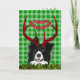 Cheerful border collie dog with antlers wearing a Merry Christmas banner. This adorable design has a festive bright green chequered background. The inside template is ready for your personal family photo.