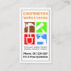 The four creative icon logos design can represent some of the work you might offer e.g. the brown hammer can be for carpentry and renovation works, the roller brush is for home painting, the power plug is for electrical works and lastly the blue faucet for plumbing. To reflect this, below this design is a list of services that you can change to suit your own needs. This is followed by the contact details near the base with the business name at the top of the card.