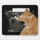 orange or ginger coloured tabby cat yawning in front of a vintage type writer.....bored or blocked writer concept
