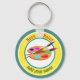 Main focus is a artists palette with colorful splodges of paint and two paint brushes through the hole. One brush has blue paint on the bristles the other has pink. The design is inside a white circle with a blue rim. A yellow outer circle has two templates to personalize. One at the top to add a message and one at the bottom to add your name. Lastly the blue outer circle is a background colour that can be changed by clicking on customize and selecting the background colour of your choice.