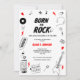 Celebrate the upcoming arrival of your little rockstar with this bold and playful “Born to Rock” baby shower invitation! Featuring fun hand-drawn doodles like electric guitars, headphones, vinyl records, microphones, and lightning bolts, this black, white, and red design is perfect for parents who love music and want a modern, edgy baby shower theme.