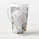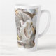 Boss lady seashells tall latte mug. White mug with wrap-around seashell photography. Pink-orange, thin script is used for "Boss lady" text printed over a white sand dollar.