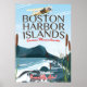 Boston Harbour Massachusetts, USA vintage style cartoon travel poster featuring a classic light aircraft flying over the islands.