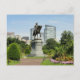 This Boston postcard features an image of the the Equestrian Statue of George Washington at the entrance of the Boston Public Gardens with the skyline of Boston's financial district in the background.