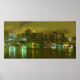 The lights from coastal buildings in Boston shimmer and create colourful ghostly images on the still harbour waters at midnight.