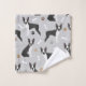 Cute Boston Terrier dogs with black and white coats sit and stand scattered dog bones and paw prints pattern.